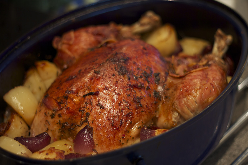 3. Now get the potaotes and put them around the chicken and do the same with the halves of onion. Grab the sage and either with scissors or a knife cut up roughly and put around the chicken. Grab the thyme and chuck a few sprigs here and there. Now Chuck on the lid and put in the oven on about 200 for 30 mins then turn the heat down to 150-160 and cook for a further hour and a half. Every 30 mins or so get out the oven and try and baste the liquid over the chicken and potatoes. If you can get one of those basting things it’s a lot easier than using a spoon. Give the potatoes a rough jostle and stir around. Just be careful not to break up the potatoes too much. It is ok if they do a bit so don’t worry too much.