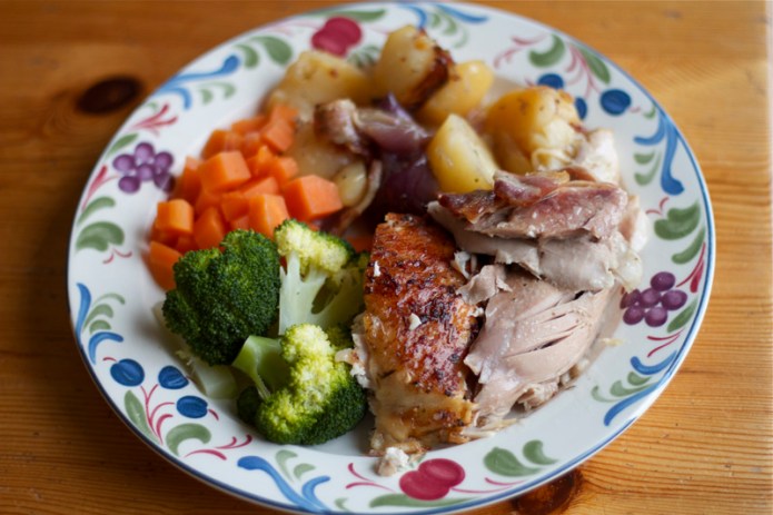 6. Grab the chicken out the oven. Remove the chicken from the pan and put on a chopping board to rest. Chuck the pan back in the oven to help crisp up the potatoes a bit. Carve the chicken (I’m going to get a tips and techniques section up soon to show you a great way of doing this) Serve it all on a plate, just make sure to get each plate with a nice mix of the onions, potatoes and bacon with the chicken. Yummy!