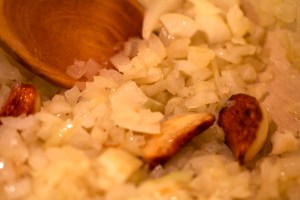 1. Right, get a nice deep sauce pan on a medium heat and add the extra virgin olive oil and add garlic cloves. Let these take on a bit of colour on all sides which would take about 2 mins then add the onions and season with a pinch of salt and pepper. Keep stirring every min or so. We want to let them cook gently and sweat down a bit. Will take about 6-7 mins