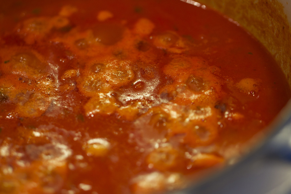 4. Let this come to a gentle bubble and turn down so it’s simmering gently and chuck in a big handful of cherry tomatoes, leave them whole, they just split and melt into the sauce after a while. Now, the biggest mistake people make is to not cook this sauce for long enough. 2 hours would be ok. Longer would be better. With you just simmering it you only really need to stir it every 20 mins or so. It shouldn’t stick. You can go off and chuck a movie on or chat with your mates or something, maybe even a cheeky glass of wine (especially as you have half a bottle of red knocking about). Try to give it at least two hours. Now taste and season with salt and pepper if needed. If it tastes a bit sharp then add a spoon of sugar, stir and taste.