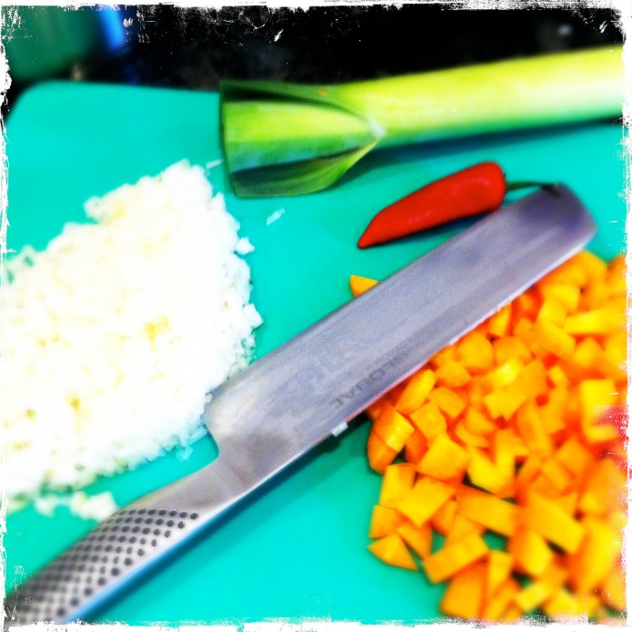 1. Right so in a deep saucepan put it on a medium heat and add some extra virgin olive oil. Add the onions and carrots and a small pinch of salt and sweat down gently for a few mins. Now add the leeks, the chilli and a small knob of butter. Season with a small pinch of salt and some pepper. Let this cook for about 2-3 mins.