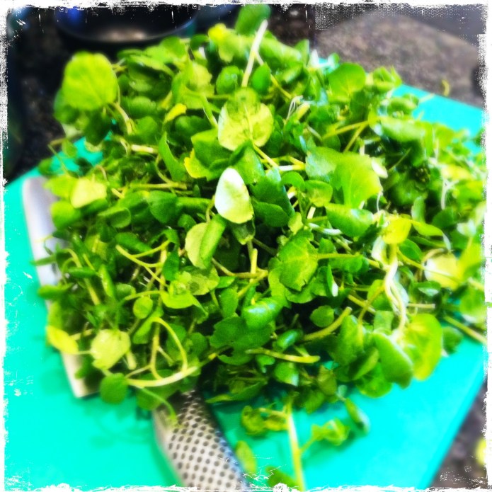 2. Now add the chopped watercress and a pinch more salt and a generous pinch of pepper. Let this cook for 2 mins then add the stock and stir well. Let this come to a simmer and give it 3-4 mins.