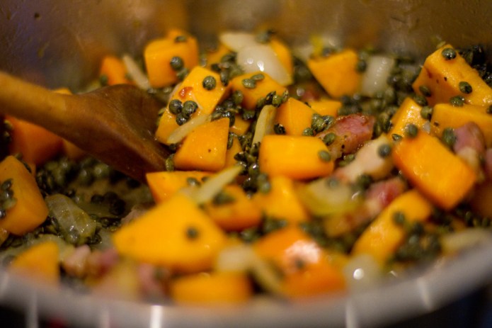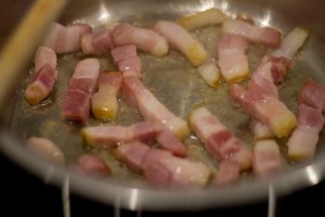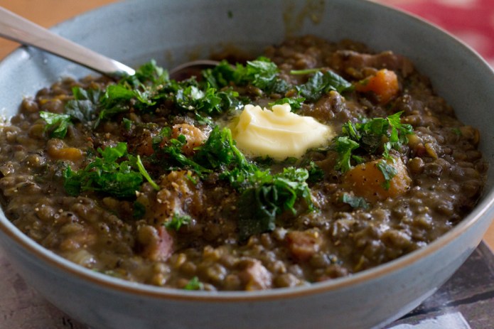 So a nice little lentil recipe, I think it’s quite a traditional recipe but this is another one from my friend Delphine. This one will probably make it into the book but I’ve not quite figured out what to have this with yet so this is just a nice little lentil thing to have with some salad or some roast chicken. Super healthy and good if you are a vegetarian. Obviously leave out the bacon, unless you are one of these vegetarians who likes bacon although that would be weird.