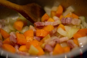 1. ok so dice the carrot and onion. Get 2 cloves of garlic and a peel and add to a pan with some extra virgin olive oil. Let this cook for a min or 2 so it takes some colour on all sides then add the bacon, cook for a few mins so it starts to crisp up a bit then add the carrot and onion. Season with salt and pepper and cook for about 6-7 mins. Cook this over a medium heat.