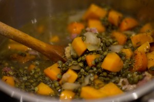 2. Now add the green lentils. About 200 grams should be plenty. Give this a stir and add the stock and a teaspoon of dried thyme. 500ml of stock should be about right initially. Let this come to the boil and then turn down to a simmer. Put on the lid and let this cook for about 30 mins.