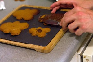 6. After they have cooled get your chocolate melted in a bowl over some lightly simmering water. As soon as it has melted remove from the heat and begin to spoon over the ginger bread men, using a knife to do the more detailed bits and to smooth it over. The style of ninja is up to you. Have a look on google for some ideas if you like or just go crazy. Allow the chocolate to set before you add the icing. You can put them in the fridge for 10 mins to speed this process up. Give them little belts and add the eyes and any other details you fancy. Once done pop back in the fridge for 20-30 mins to allow everything to set then eat away. Just watch out as they may try to fight each other.