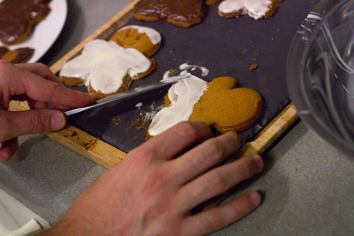 So, back to the ginger bread ninjas. Now, to become a fully trained ginger bread ninja they need to go through a rigorous training process. This involves being smothered in dark chocolate, white chocolate then decorated with icing of various colours. After this process they must survive in a refrigerator for at least 30 minuets. Only after all this can you claim to have ginger bread ninjas.