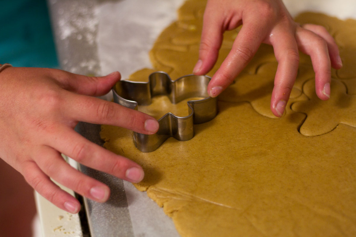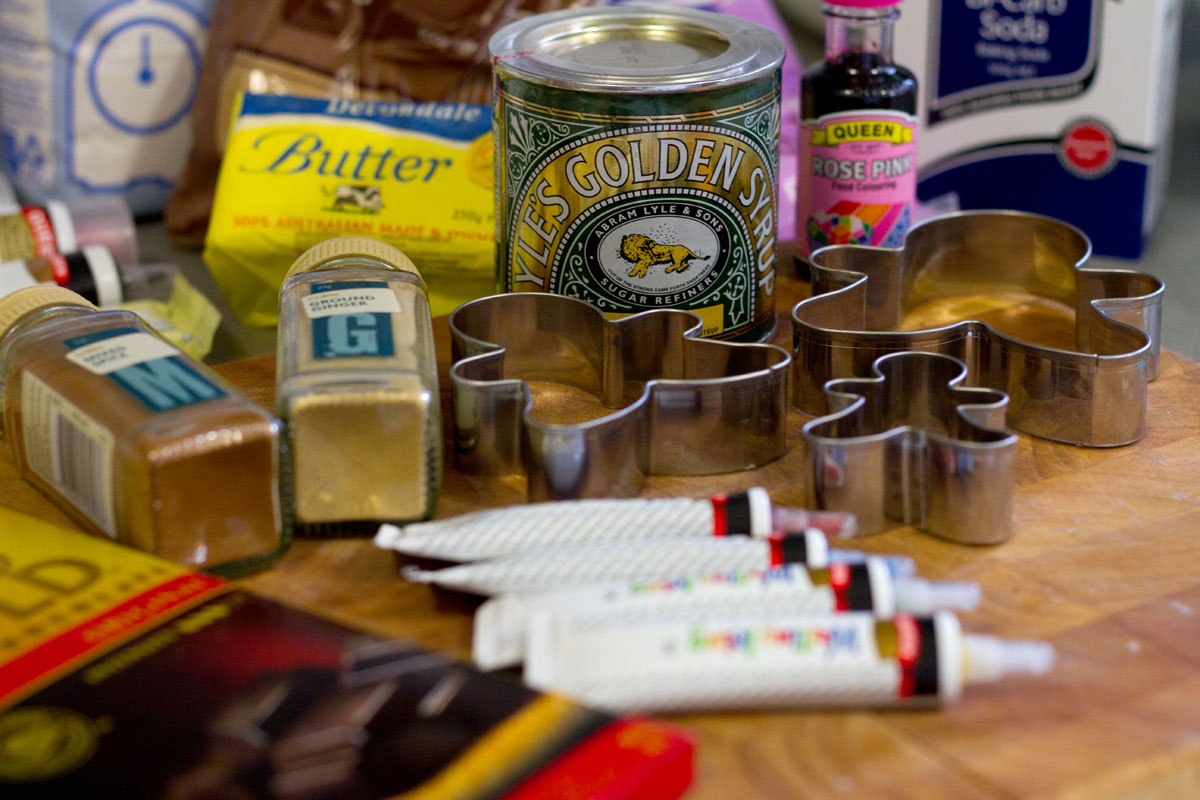 4. After the dough has rested for 30 mins, place between 2 sheets of baking paper and roll out until about 4mm thick. Use a gingerbread man cutter (size is up to you) to cut out shapes. Place on trays about 3cm apart as they will expand as they cook. If you put them too close you’ll end up with a ginger bread orgy going on in the oven. Repeat with any excess dough.