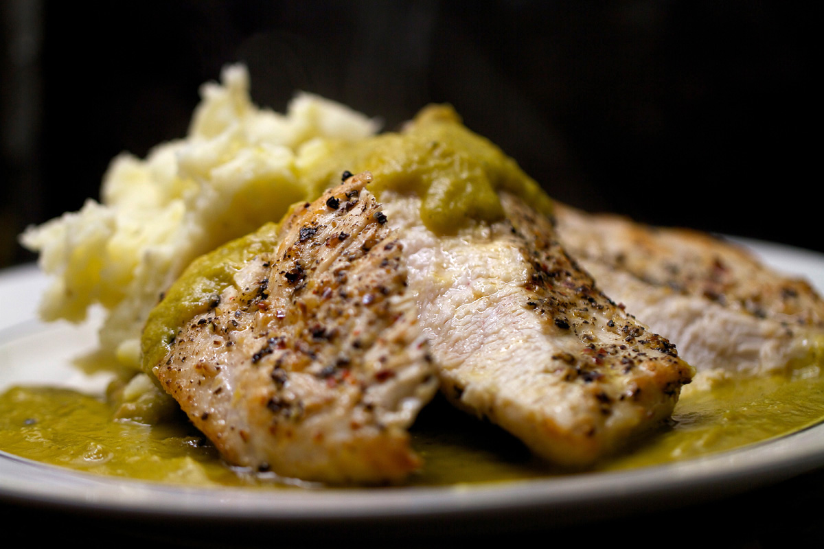 4. Slice the chicken and serve on the plate with the mash and soup. Add a few more dried chilli flakes if you want a bit of spice!