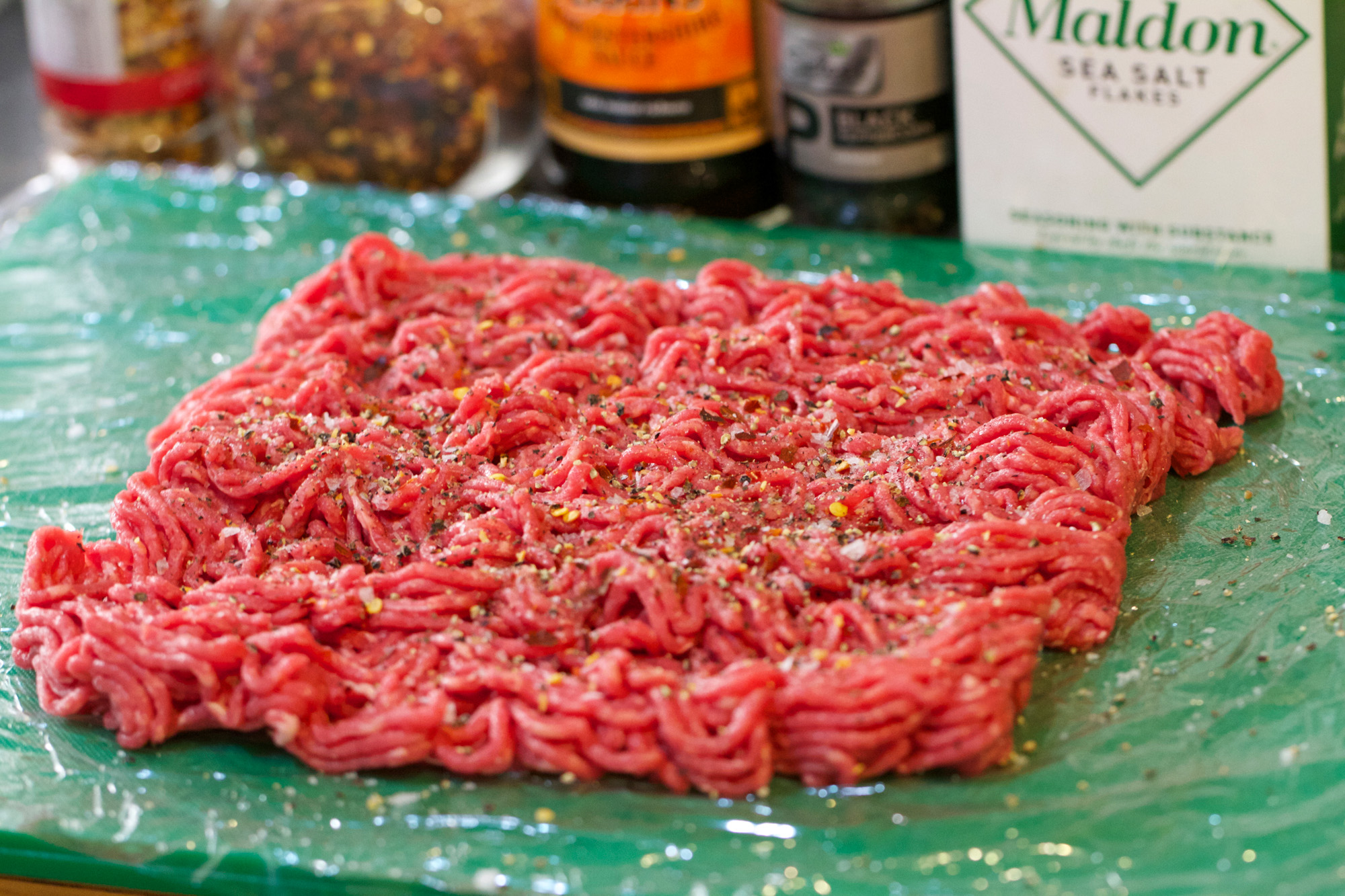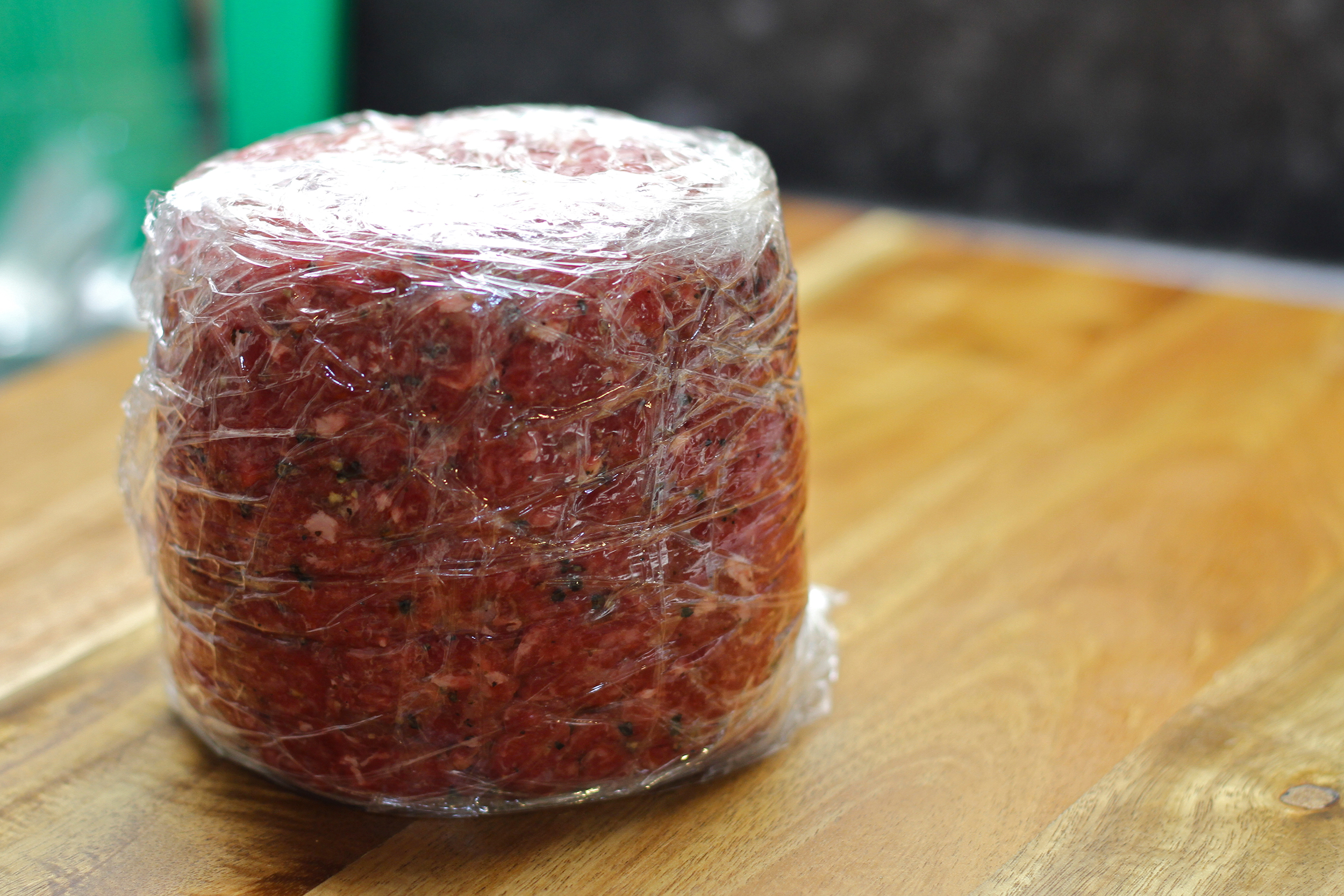 So for this one I’ve just kept it pretty simple. I went through a phase of putting lots of cool stuff in the beef patty mixture as well but I think if you’ve got good quality beef mince then you don’t want to do too much to it. I have stolen Heston Blumenthal’s technique for rolling the beef as it works really well, plus it actually takes less time to do it like this than hand forming each one.