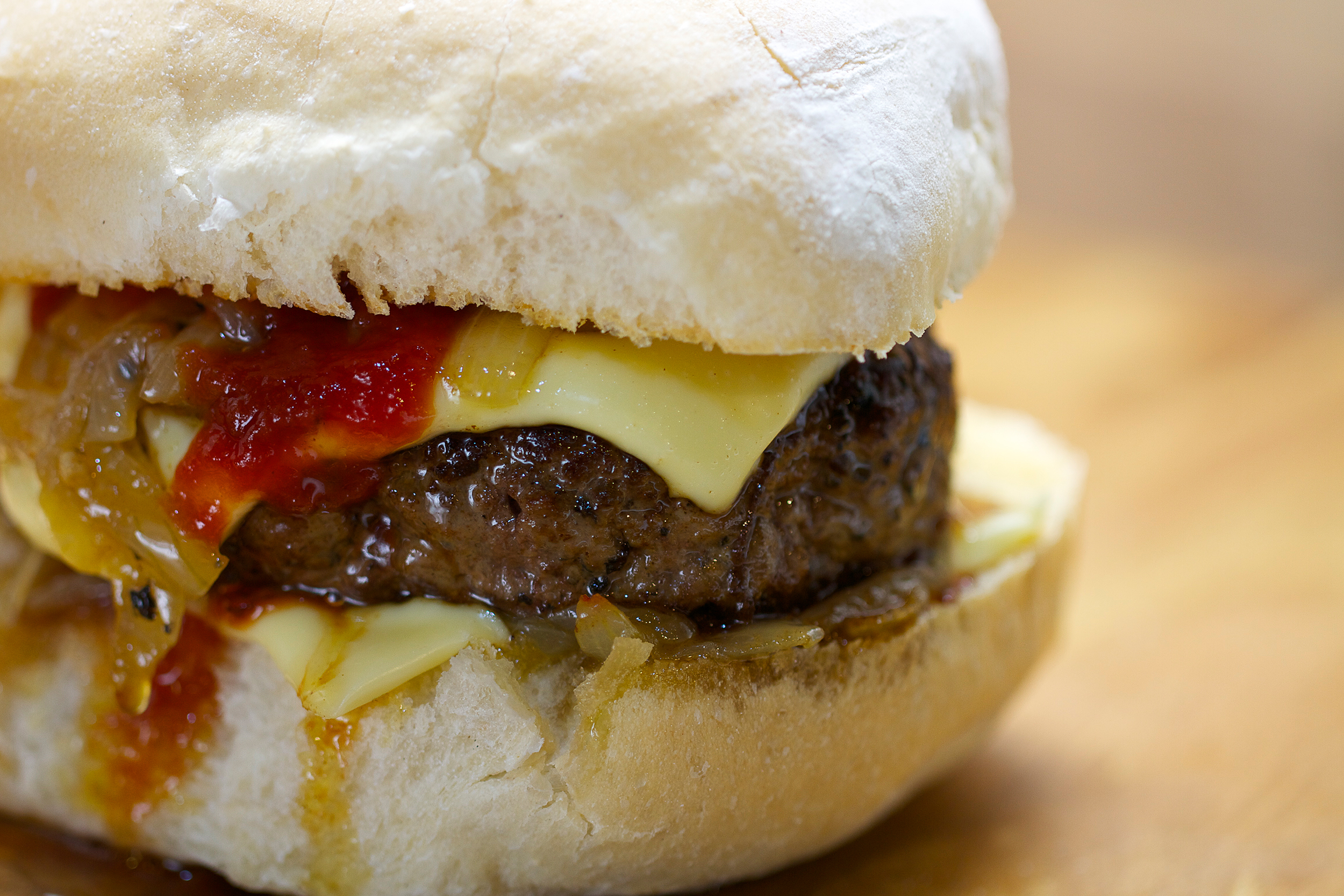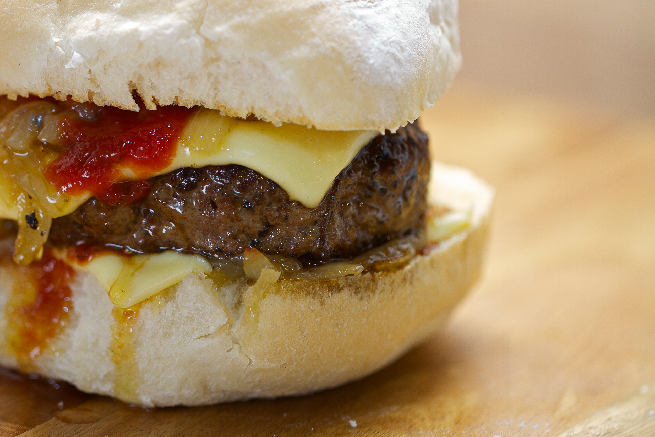 5. I put a slice of cheese on the heel of the bun while it was under the grill then I put a bit of tomato sauce and some onions, then the beef patty, then more onions then more sauce then the top. Sorted. Have some salad in there if you want to pretend to be healthy.