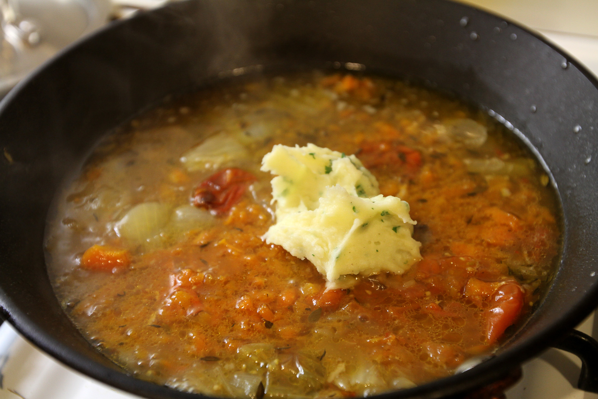 Bring this to a simmer and smash everything up into the liquid. Now add a spoonful of the mash into the sauce and mix well. This will thicken the gravy.