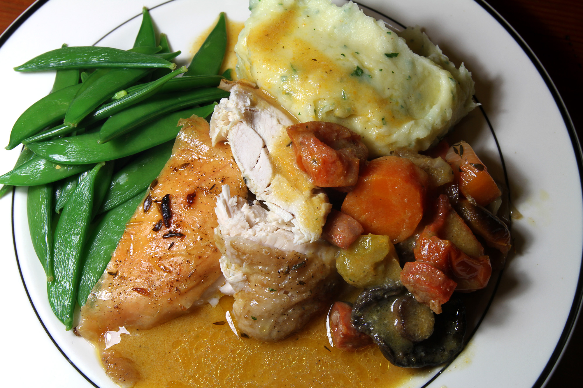 Carve the chicken, pop on the plate with the mash and some of the vege mixture from the casserole dish and serve with some extra vege of your choice. I used some sugar snap peas.