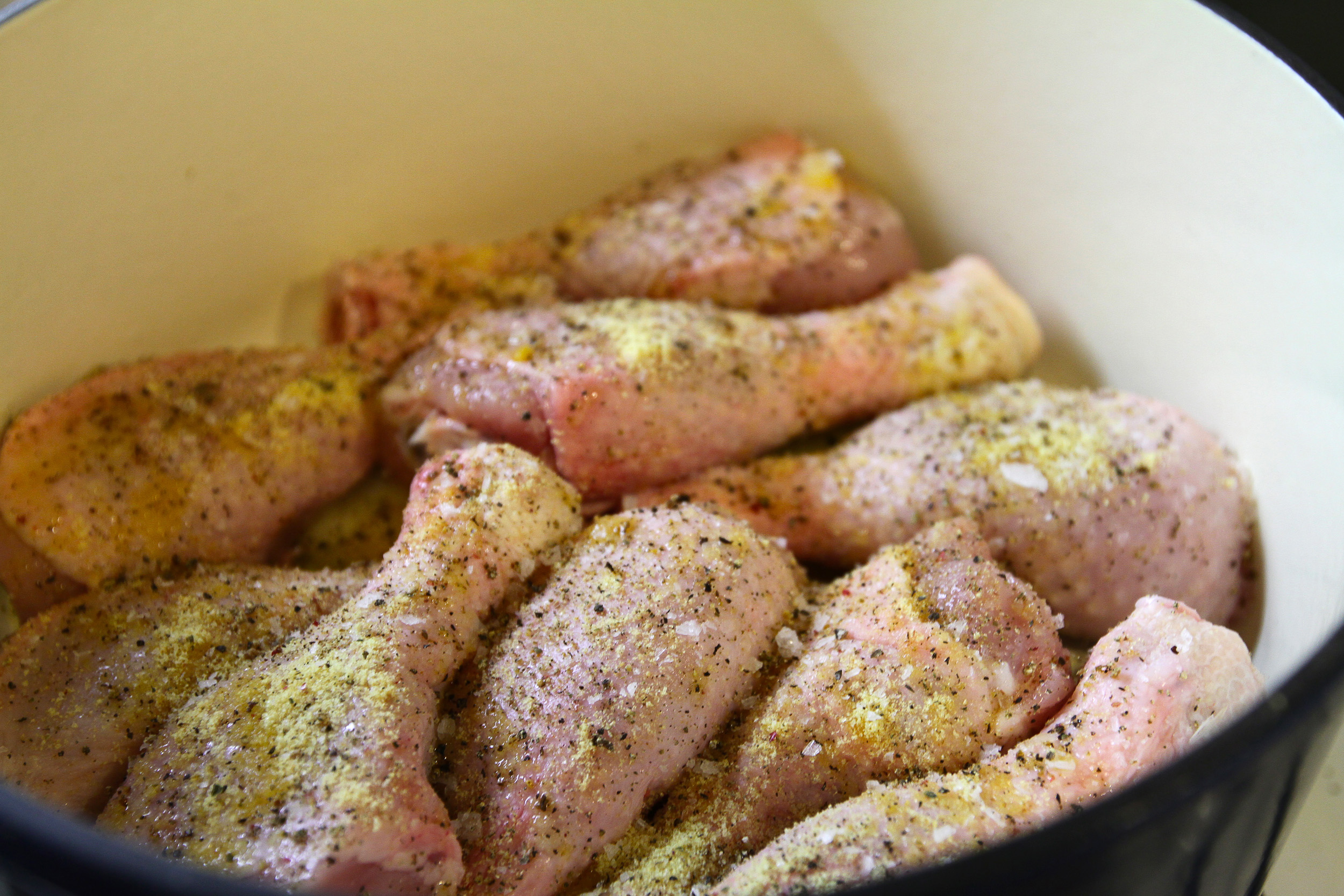 Now add the chicken legs on top, season with salt, pepper and olive oil. You can add a sprinkle of chicken stock powder if you like. Add a sprinkle of the dried herbs, pop the lid on and pop in the oven.