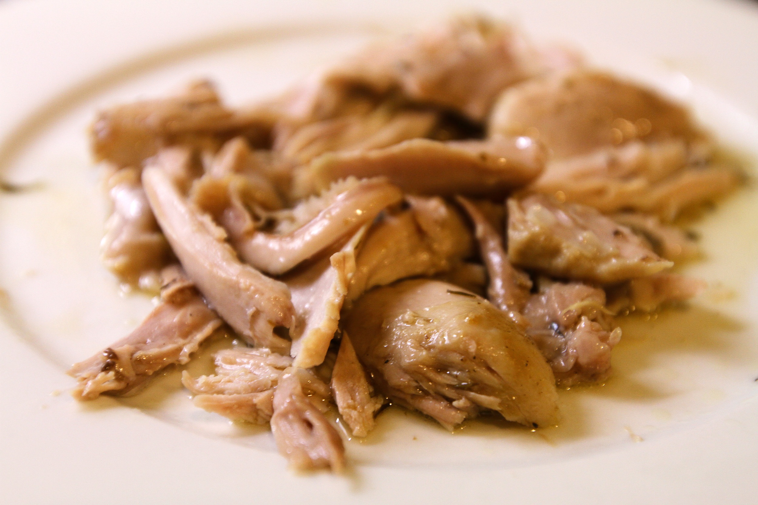 2. Now get pan from the oven remove the chicken legs and strip the chicken from the bones. Pour a ladle or two of the juices from the pan over the stripped chicken.