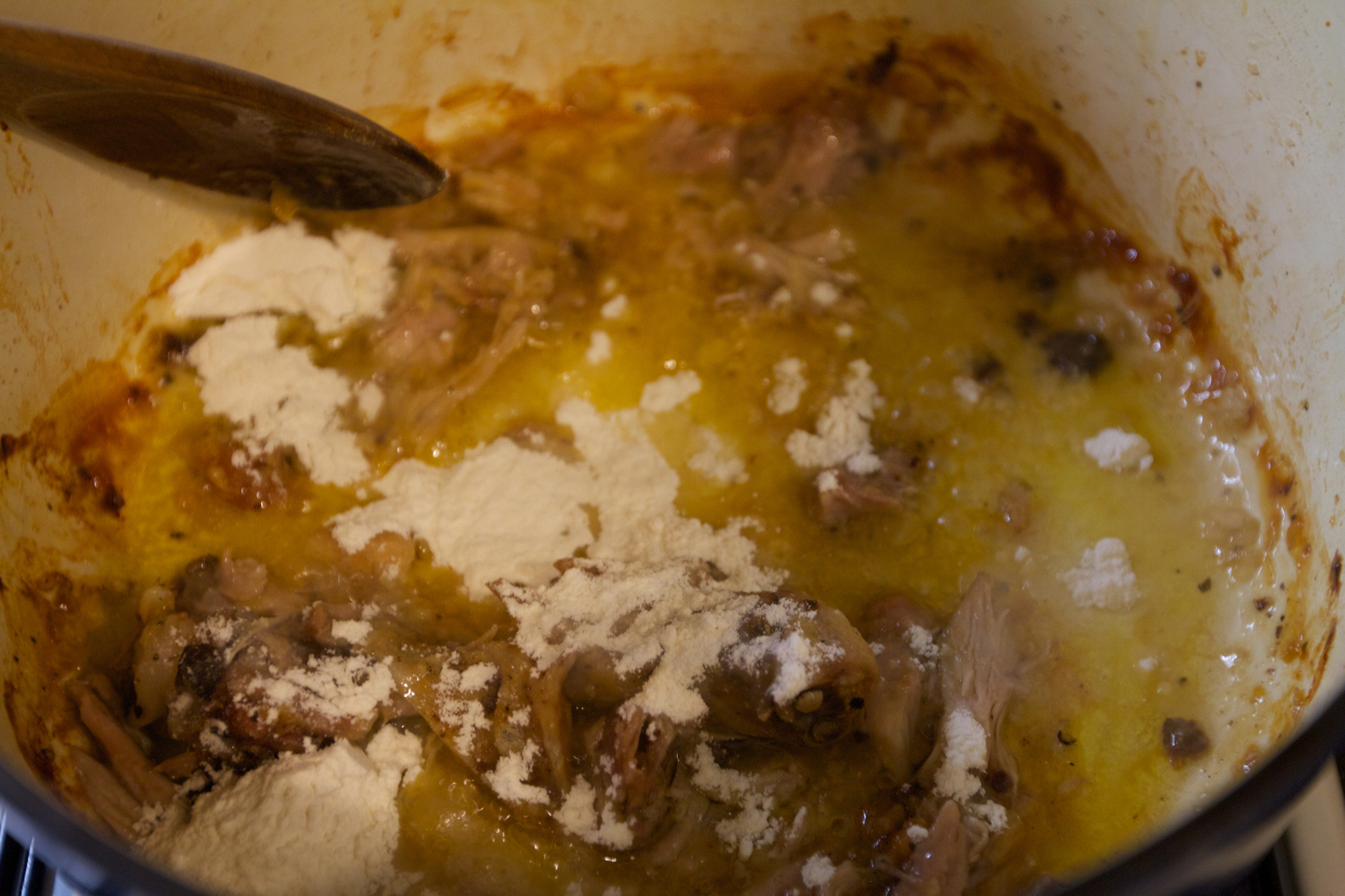 Now add the rest of the chicken stripped from the legs. Just roughly pull the chicken from the legs, keep the size nice and random.