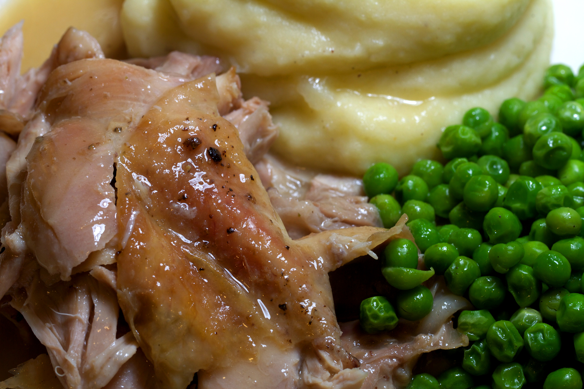Now plate everything up. I just stripped the chicken from the bones into a nice pile on the plate and added the mash and peas then added the gravy poured over the chicken. Sorted!