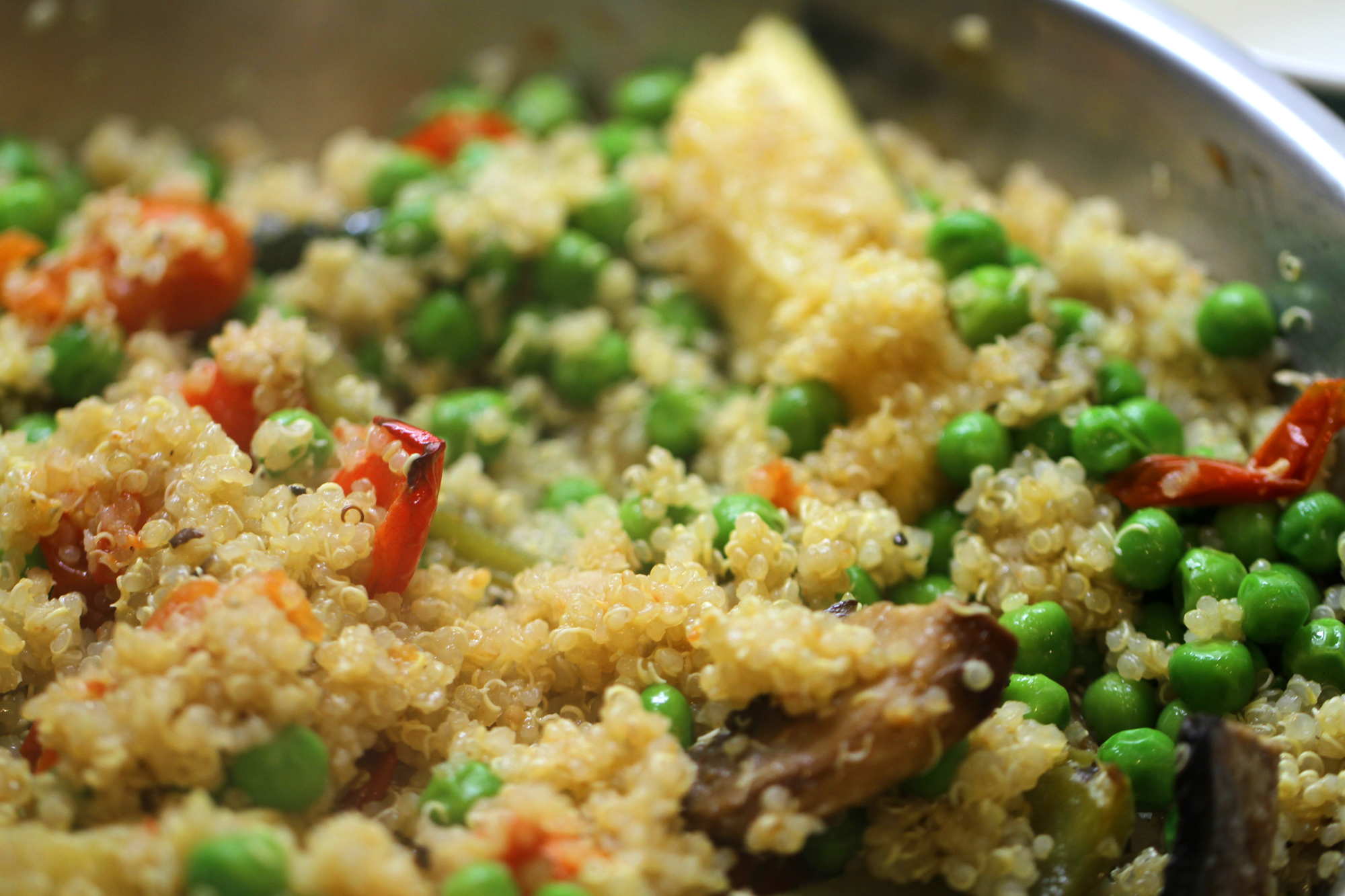 Now remove the roast veggies from the oven and add to the quinoa and mix then add the peas. Add a squeeze of lemon juice and grate one apple into it and stir. Taste, season if needed.