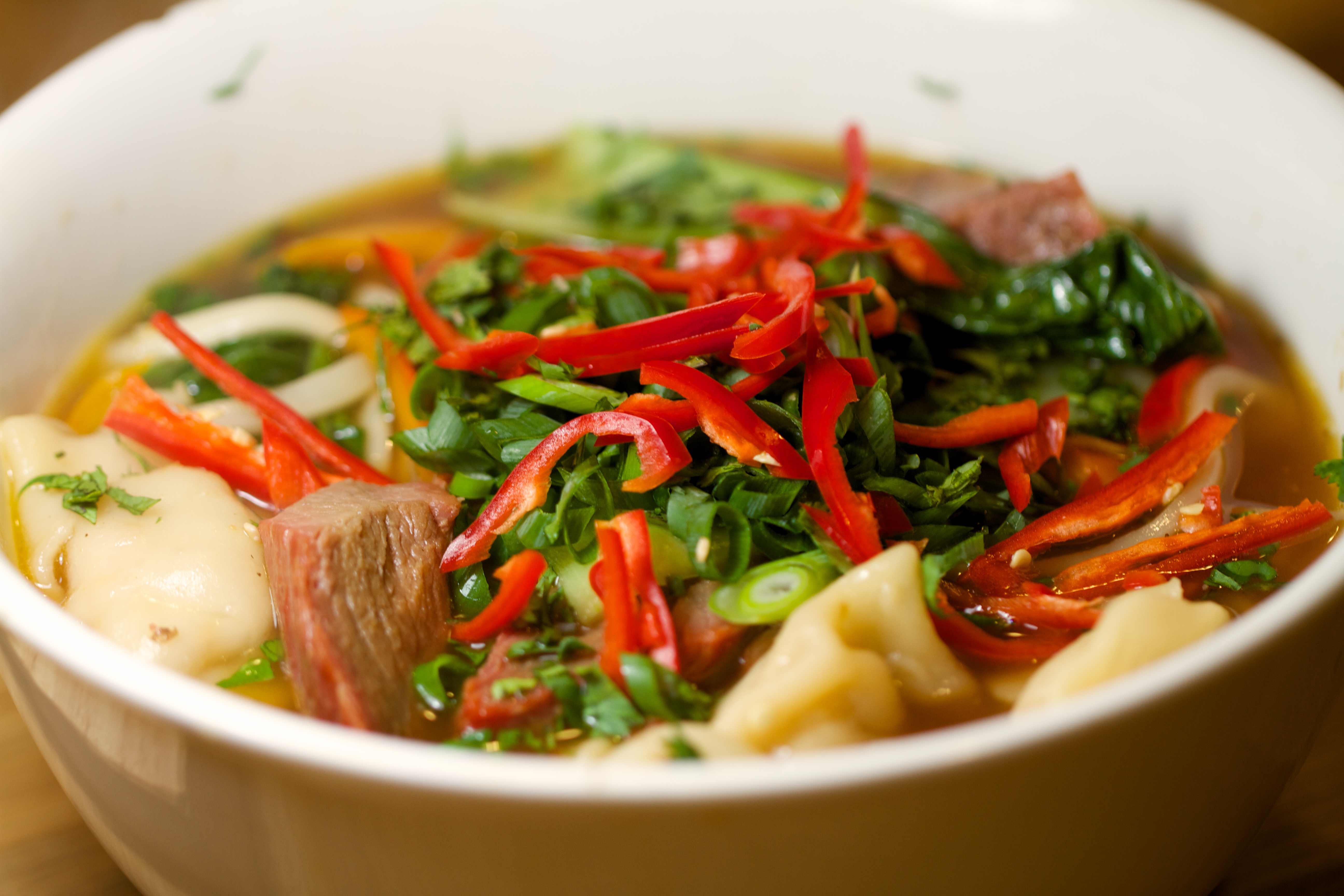 Now I just simply added the pork to the stock along with the dumplings (I just bought these from the Chinese supermarket) While these were cooking through I fried off the peppers and mushrooms over a high heat then added the ginger. This takes about 3 mins then add this mixture to the stock. Now add the kale and pac choi and pop the lid on. Give this 2 mins then add the noodles and cook for another 2 mins. Thats pretty much it. Serve in a bowl and add the bean sprouts, sliced red chilli and finely chopped corridor on top. Eat and enjoy. Really tasty and super healthy. It’s pretty quick too if you have some chicken stock ready. If you don’t want to make the stock yourself then buy some of that good quality stuff you can get in the pouches.