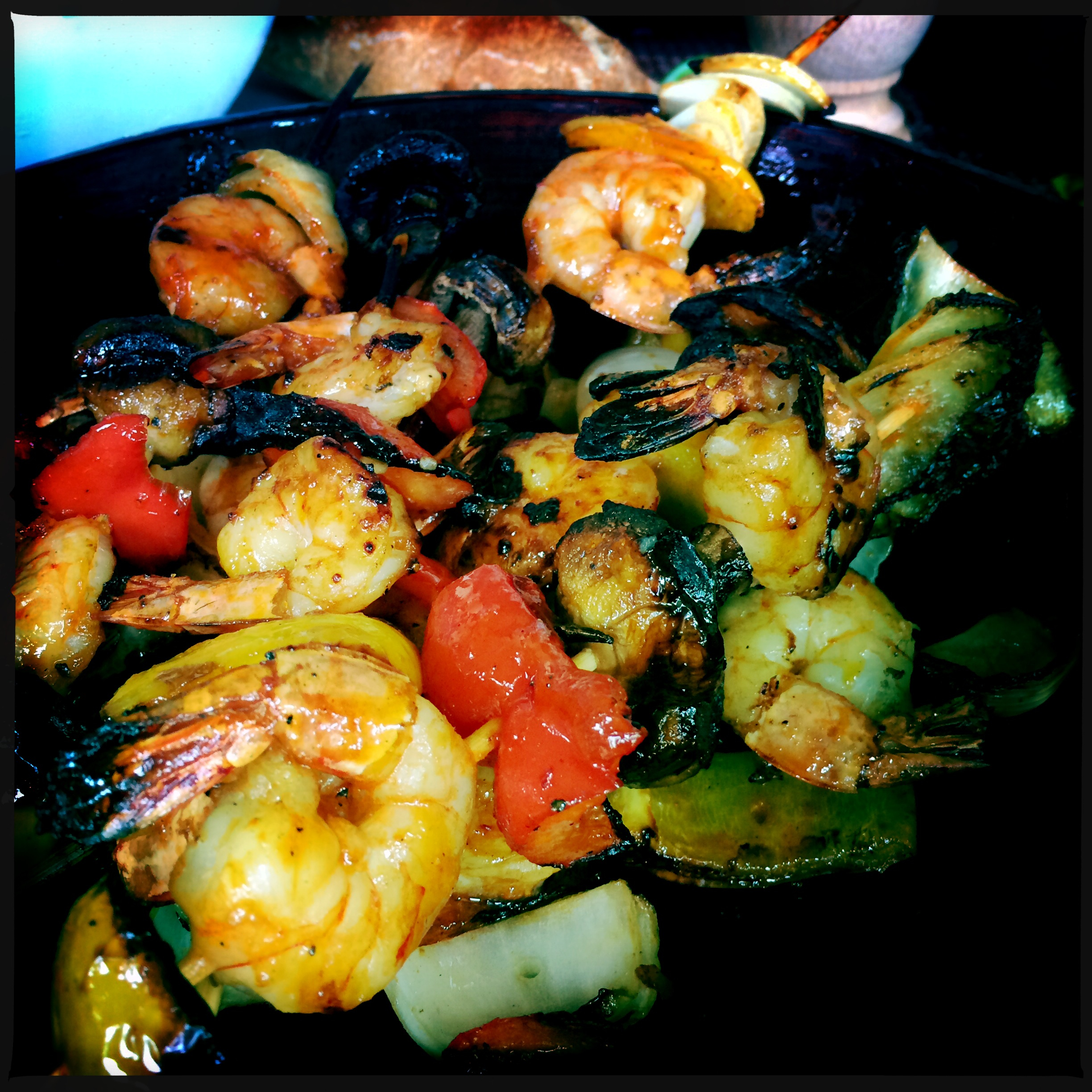 3. All I did then was to get some bamboo skewers which I’d soaked in water for a few hours and add tiger prawns, onion, red and yellow capsicum and mushrooms. I popped these on the BBQ and brushed over the marinade every few minutes and every time I turned them. Give them about 10 mins over a medium heat, turning every 2 mins or so. We want the vegetables to have some nice colour on them but to retain a bit of their crunch. Don’t have the BBQ too hot!