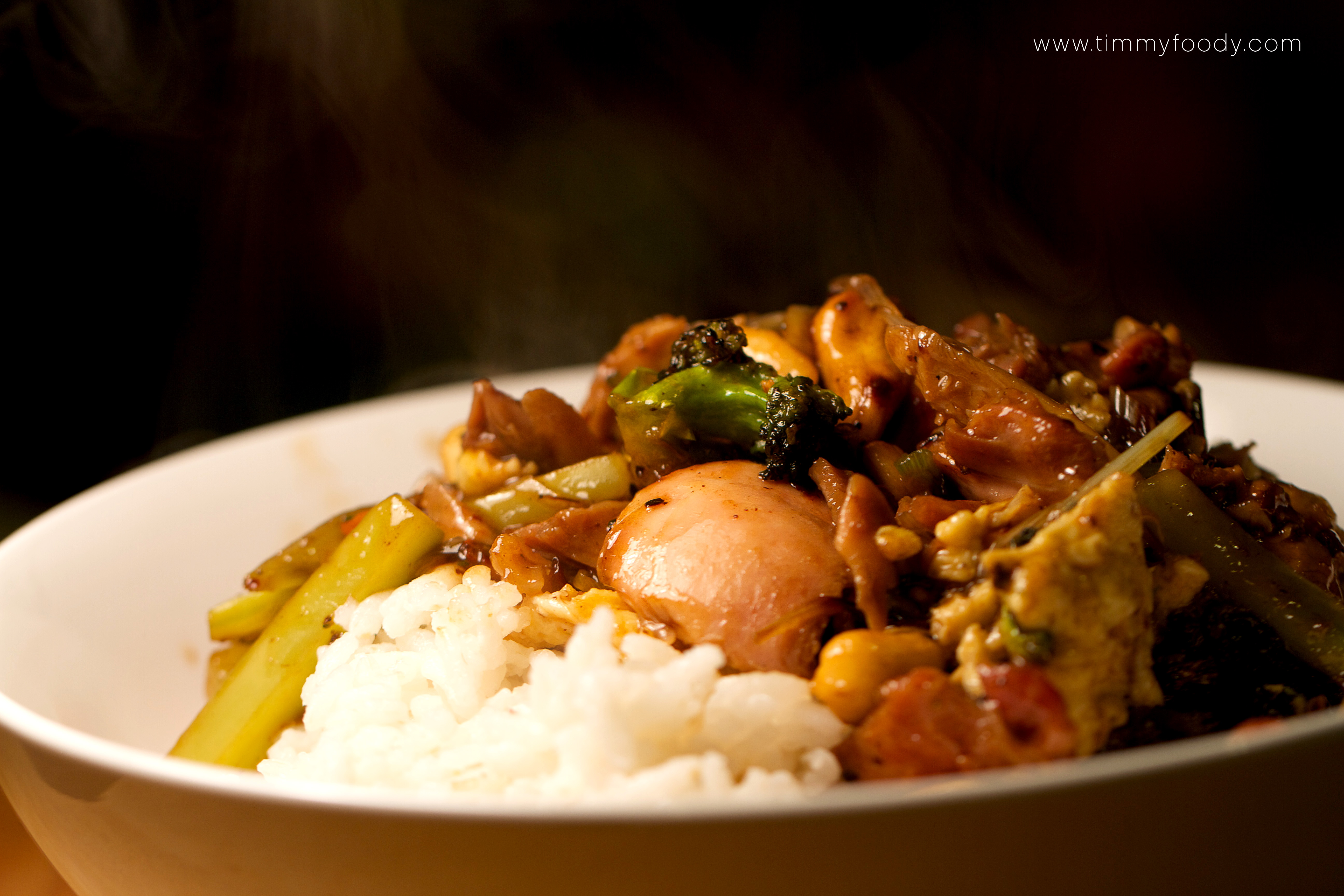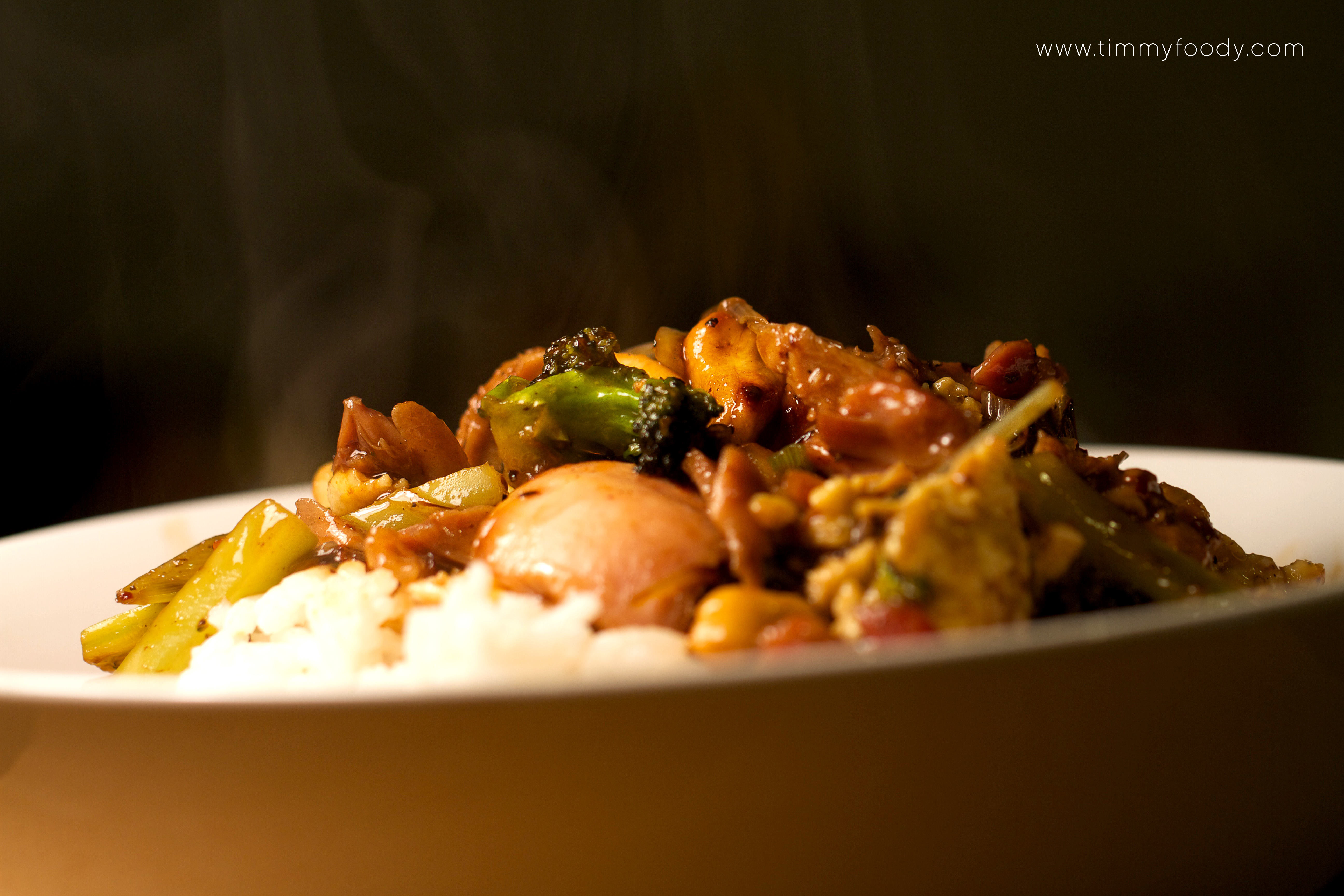 Now grab a plate. Pop your rice on it. Grab the stir-fry and give it one final stir to mix in the butter, then chuck on top of the rice. Add a garnish of fresh sliced red-chilli if you want a nice fresh zing! I forgot the chilli so I had to go without 😦