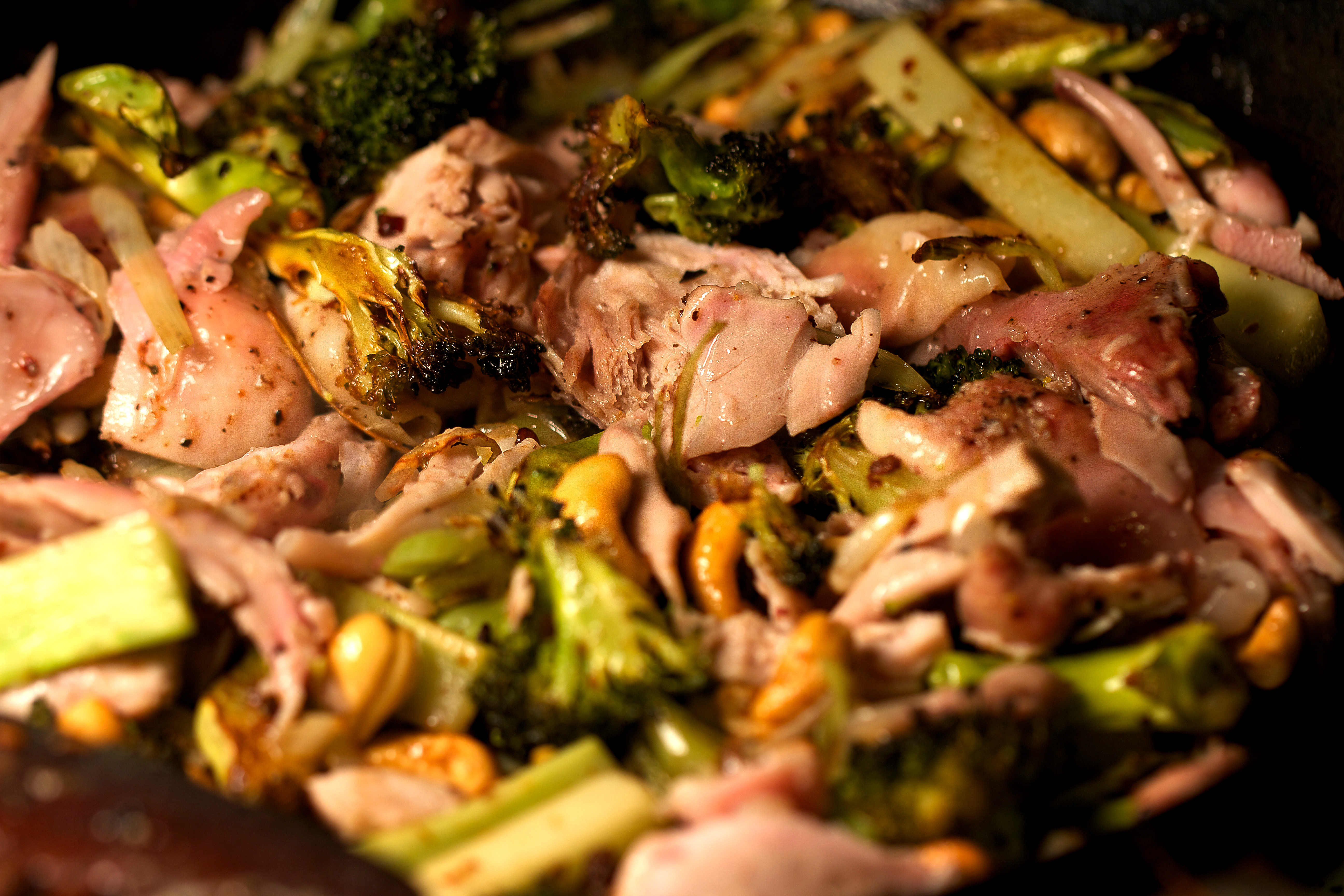 Now get the pan hot again, add a little more oil then chuck in the bowl of broccoli stalks, spring onion and cashews (and broccoli heads if you are doing it this way). Stir-fry this for about 2-3 mins then add the chicken.