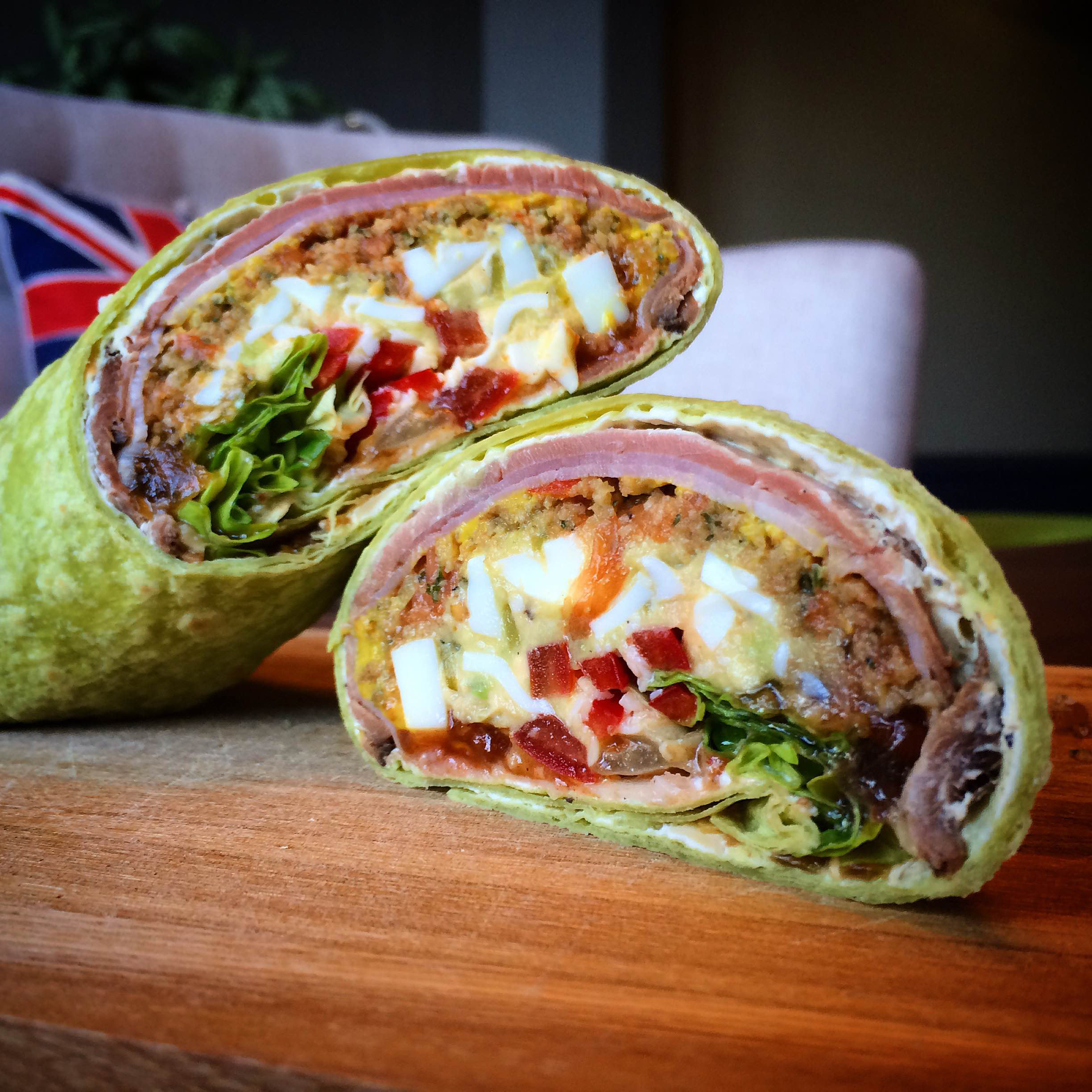 4. Now add the slices of beef, a drizzle of the mustard, then the falafel mixture then the avocado mixture. Next add the sliced of pepper and lettuce. Add the spicy tomato relish one one side and the caramelised onion relish the other side. Season with a touch of pepper on top and roll the wrap. It might be quite full by this point so it is a bit tricky but it is possible!